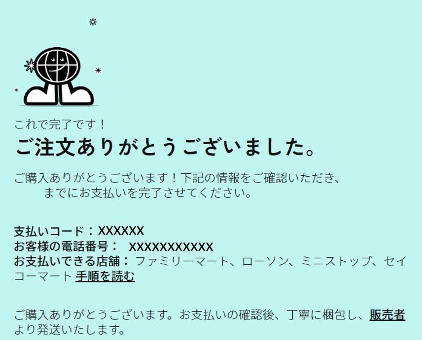 - ご注文は完了です。お支払いに必要な情報が以下のように表示されますのでご確認ください。また入力いただいたメールアドレスに「コンビニ決済のご案内」のメールが届きます。メールが届かない際は迷惑メールフォルダをご確認ください。
